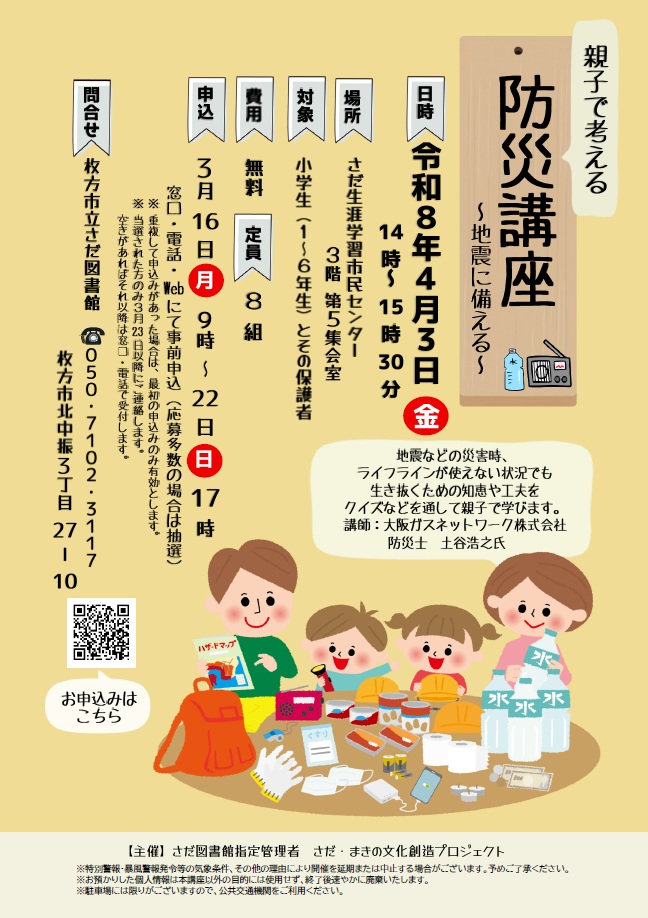 地震などの災害時にライフラインが使えない状況でも生き抜くための知恵や工夫をクイズなどを通じて学びます。